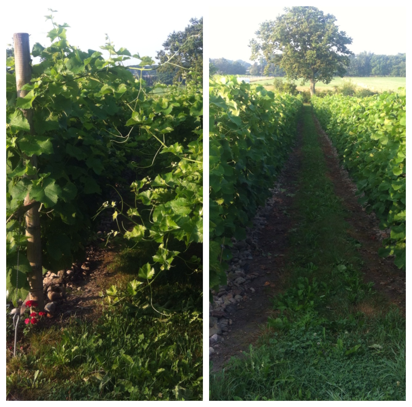 Tack vare den extrema värmen senaste veckorna, så har våra vinrankor vuxit till sig rejält. Från att ha varit knappt meterhöga, så når dom nu 2,5 – 3 upp och måste toppbeskäras. Detta av flera skäl. Dels så får lövväggen inte vara för tät, för då kan det uppkomma bladmögel. Dels så blir alltför höga och täta rankor en fara om (när) det börjar blåsa. Vi har i minnet tidigare år när höststormar har gjort att både uppbindningstrådar och stolpar har knäckts.